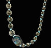 Faceted pyrite stones graduating in size, surround a chunky piece of luminous abalone in this SKS choker necklace. Tiny aquamarine beads enhance the natural pearlescent shades of silvery green, grey, and purple.
