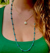 Attached to a gold-filled chain, sparkling apatite gemstones in a variety of shapes and sizes alternate with turquoise and gold-filled beads to create this feminine SKS necklace. Pearl evil eye necklace model's own.